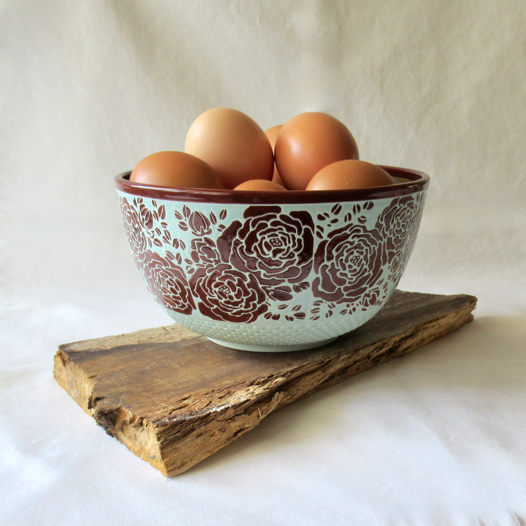 A Rouleau Loops, Buttons and White Roses on a Blue Porcelain Bowl