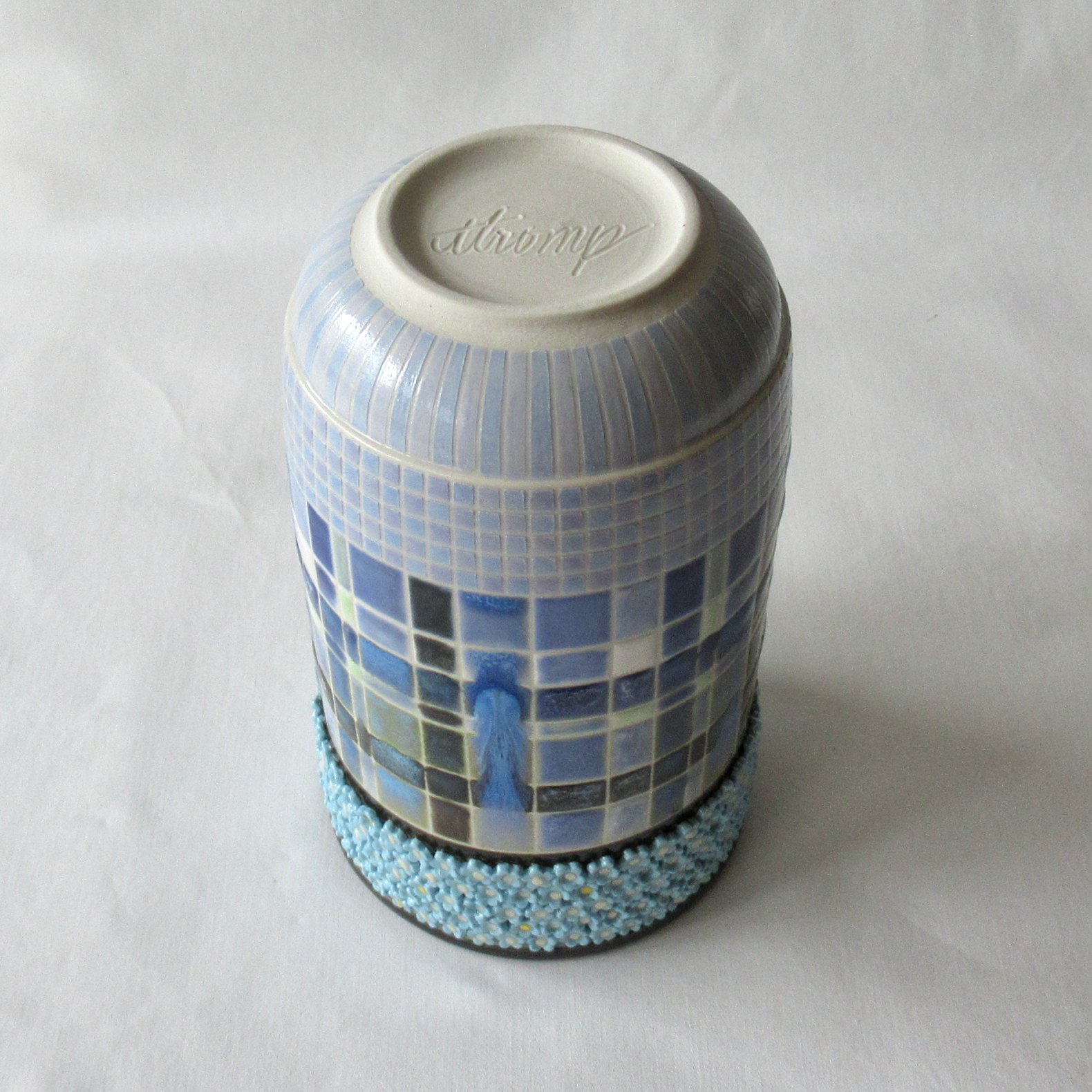 The first band above the footring is a band of light blue and pale blue stripes, alternating in color. The stripes were taped with a very narrow tape, and three coats of underglaze was applied to each negative area the tape created.