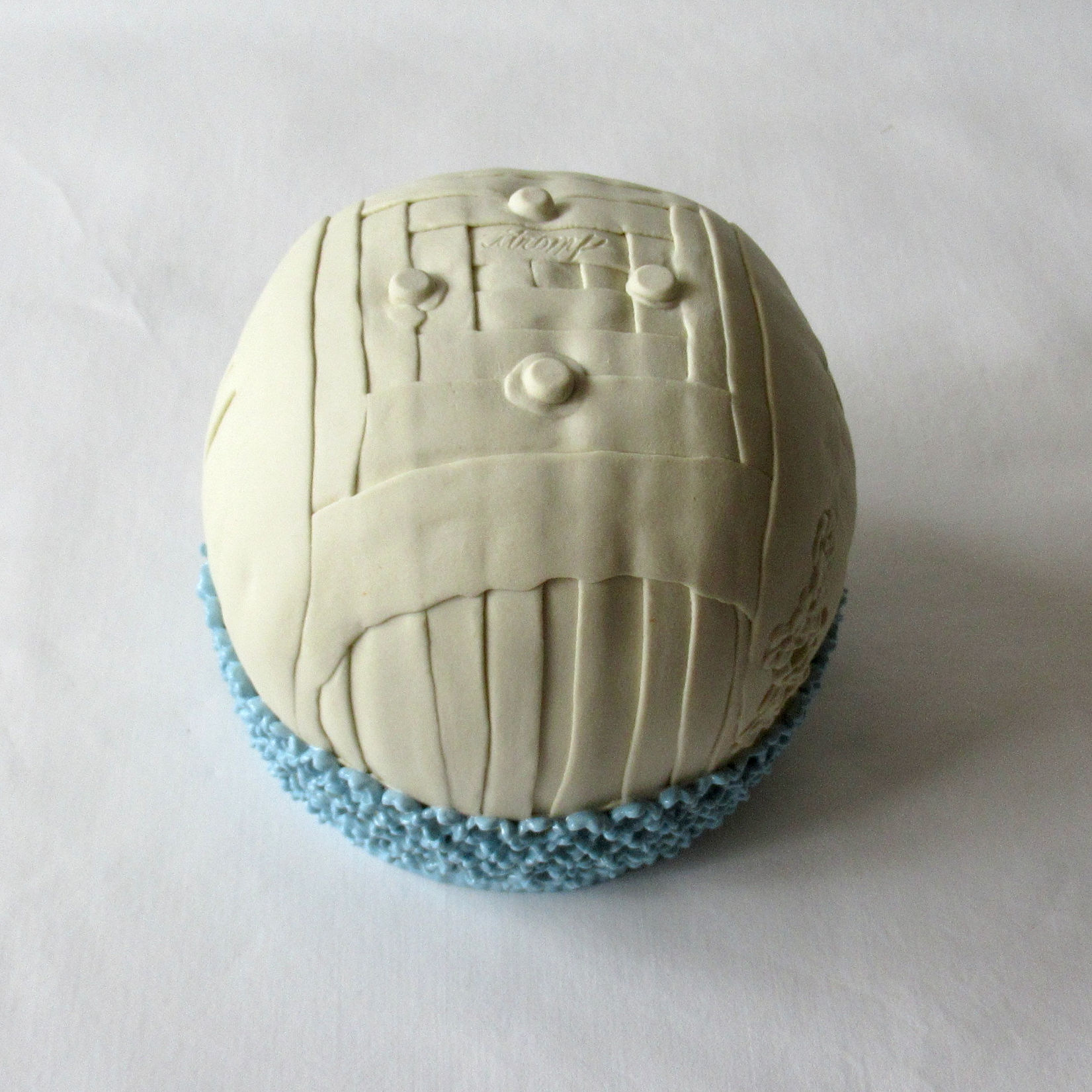 Thin strips of a light beige colored porcelain clay are arranged over the balloon in such a way to give the appearance of a weave.